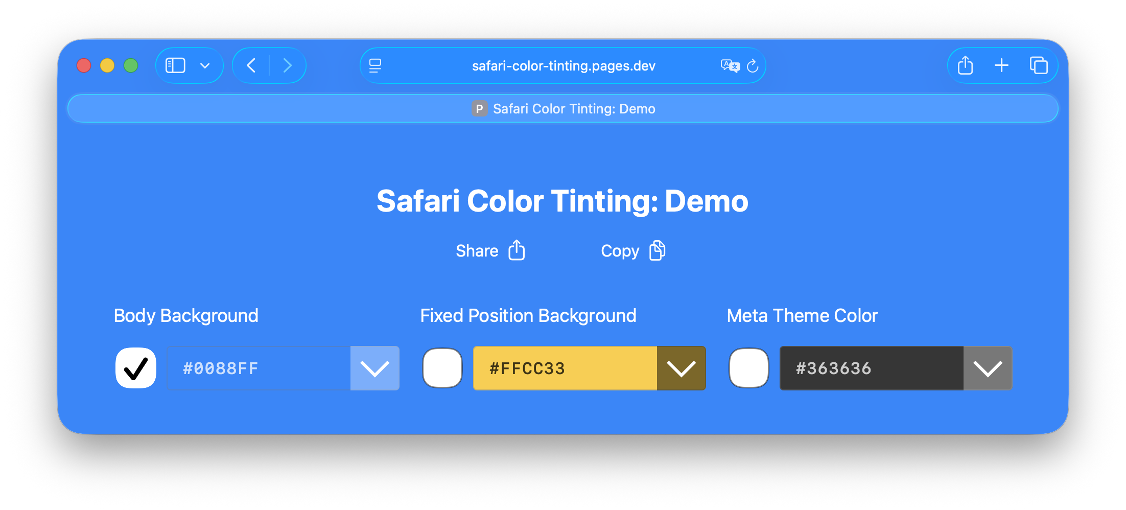 background-coloron the element itselfbackdrop-filteron the element itselfIt uses these to compute the tint color for the nearest toolbar (status bar at the top, Safari toolbar at the bottom).
